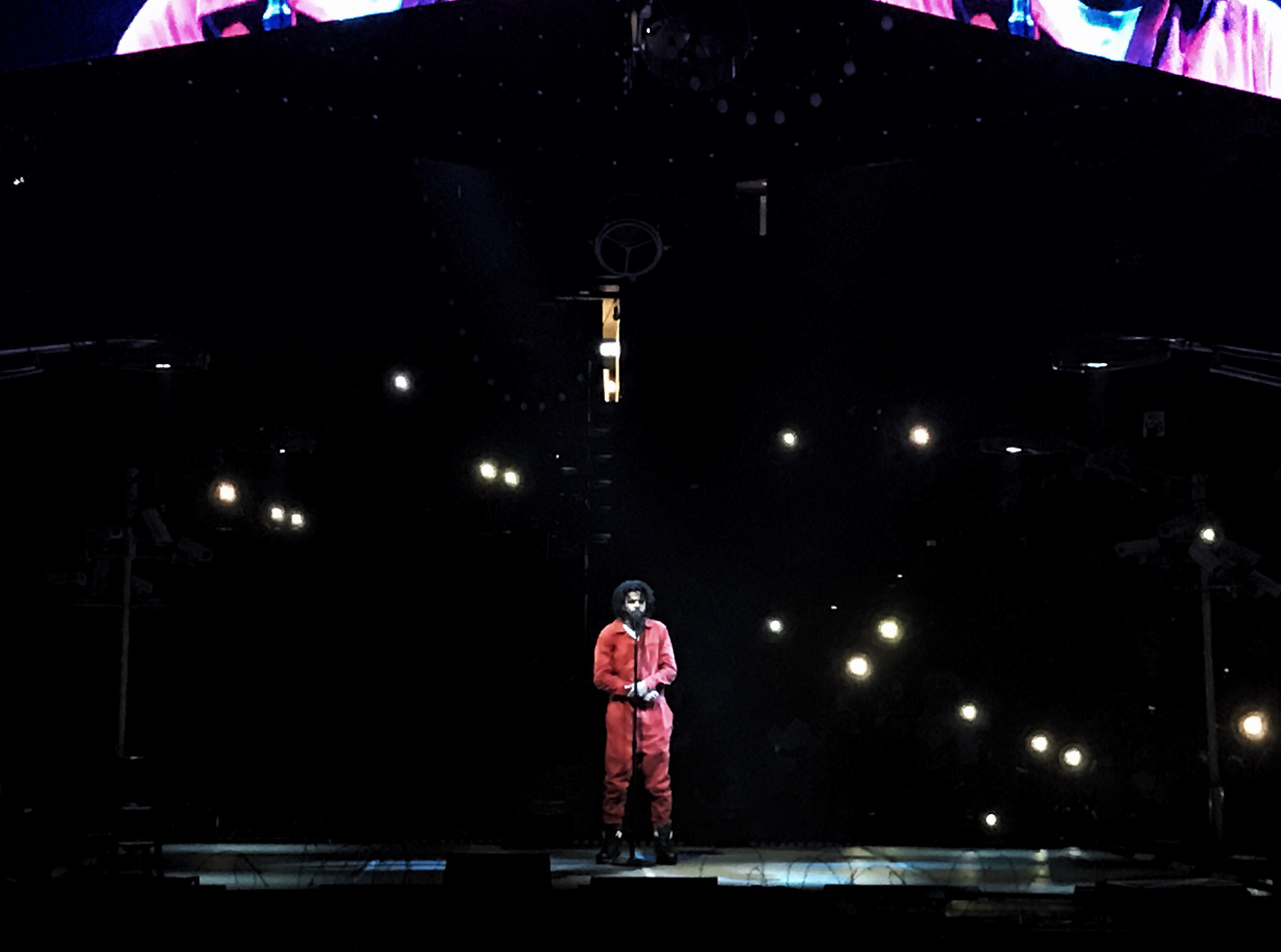 J. Cole, dressed in a bright orange prison jumpsuit, surrounded by security, walks between the crowd. The spotlight is on him, and as he makes his way to the stage, I can read the words "Property Of " printed on his back.